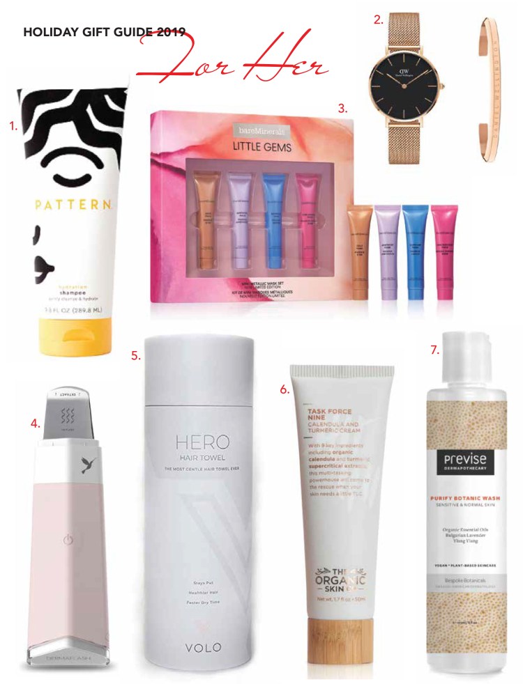 1. Pattern Hydration Shampoo | 2. Daniel Wellington Petite Melrose 32MM + Classic Bracelet Small Gift Box | 3. bareMinerals Little Gems: Mini Metallic Mask Set | 4. Dermaflash Pore Extractor & Serum Infuser | 5. VOLO Hero Quick Dry Towel | 6. The Organic Skin Co. Task Force Nine Calendula and Turmeric Cream | 7. Previse Purify Botanic Wash