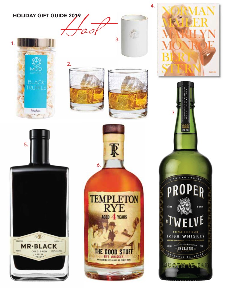 1. MODS SWEETS Gourmet Popcorn | 2. Well Told City Glassware (photo compliments of uncommon goods.com | 3. Joya Composition No. 1 candle | 4. Taschen Norman Mailer/Bert Stern – Marilyn Monroe | 5. Mr. Black Cold Brew Coffee Liqueur | 6. Templeton Rye Whiskey Aged 4 Years | 7. Proper No. Twelve Irish Whiskey
