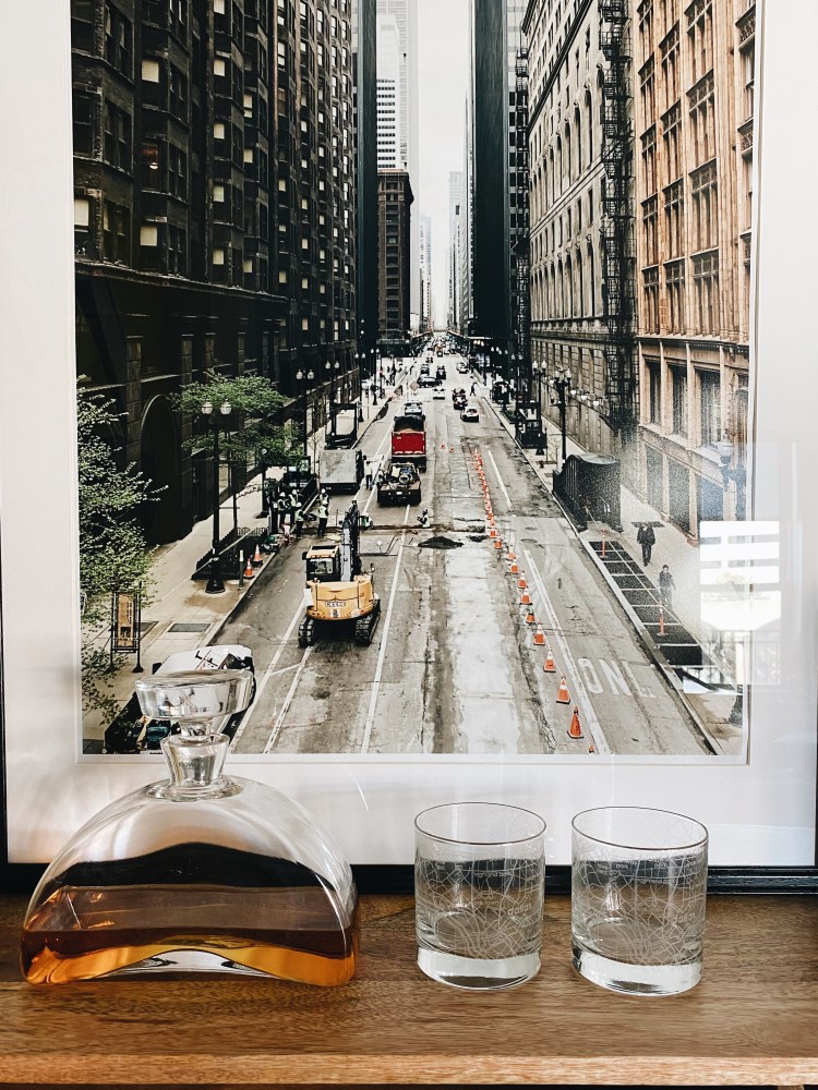 - Add some texture and dimension to the bar area with a glass decanter, bar tools and a pair of drinking glasses. The glasses (shown above) from Well Told add a really cool, local element to the bar. Their site lets you choose your city or town and a type of glassware including wine and pint glasses and coffee mugs.