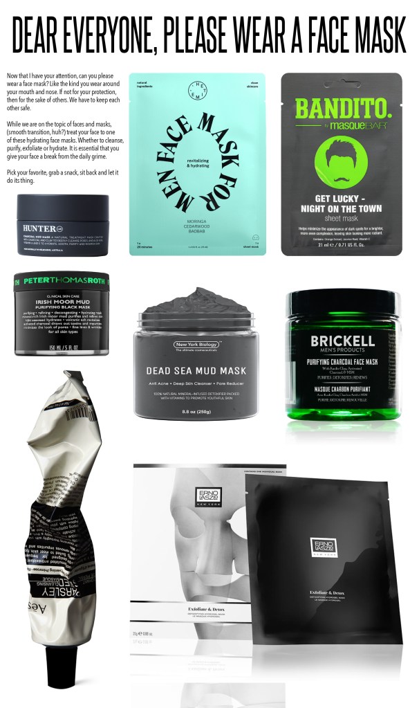 Hunter Lab Charcoal Mud Mask ($58) | Peter Thomas Roth Irish Moor Mud Purifying Black Mask ($60) | Aesop Parsley Seed Cleansing Masque ($47) | Erno Laszlo Detoxifying Hyrdogel Mask ($18) | Brickell Men’s Products Purifying Charcoal Face Mask for Men ($35) | New York Biology Dead Sea Mud Mask ($20.95) | Bandito by Masque Bar Get Lucky – Night on the Town Sheet Mask ($3.99) | HETIME Revitalizing and Hydrating Face Mask for Men ($8)