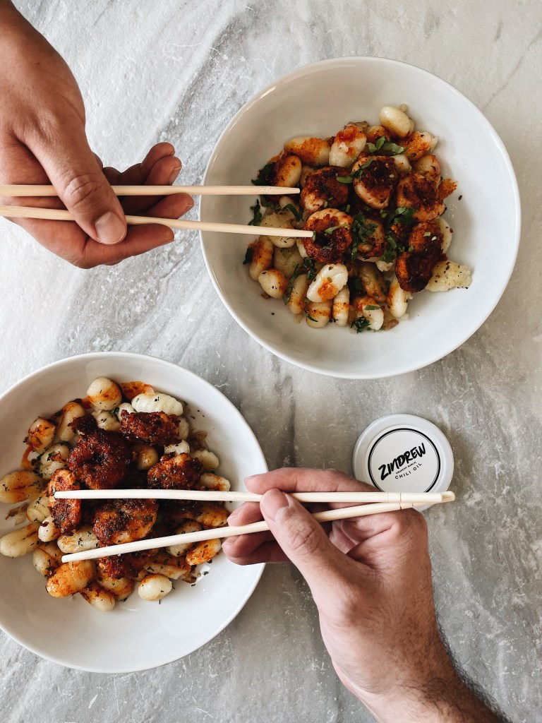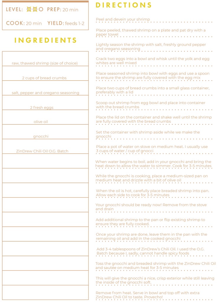 I am attempting to up my cooking game and expand my palette. I can’t handle spicy foods. Like at all. Like Taco Bell Mild sauce is my limit. Judge accordingly. However, I do like a bit of zest or flavorful kick in my food. I was hesitant to try ZinDrew Chili Oil because I automatically assumed that it was spicy. I took one for the team and whipped up this sautéed shrimp and gnocchi dish with some of the ZinDrew Chili Oil O.G Batch to see how it would taste and it DID NOT DISAPPOINT! The O.G. Batch is their less spicy chili oil so I opted to try that one first. Hey, I am taking baby steps! It was honestly such a savory dish with the crunch of the breaded shrimp and the softer texture of the gnocchi. It took about 35 minutes to make and fed me for days!
