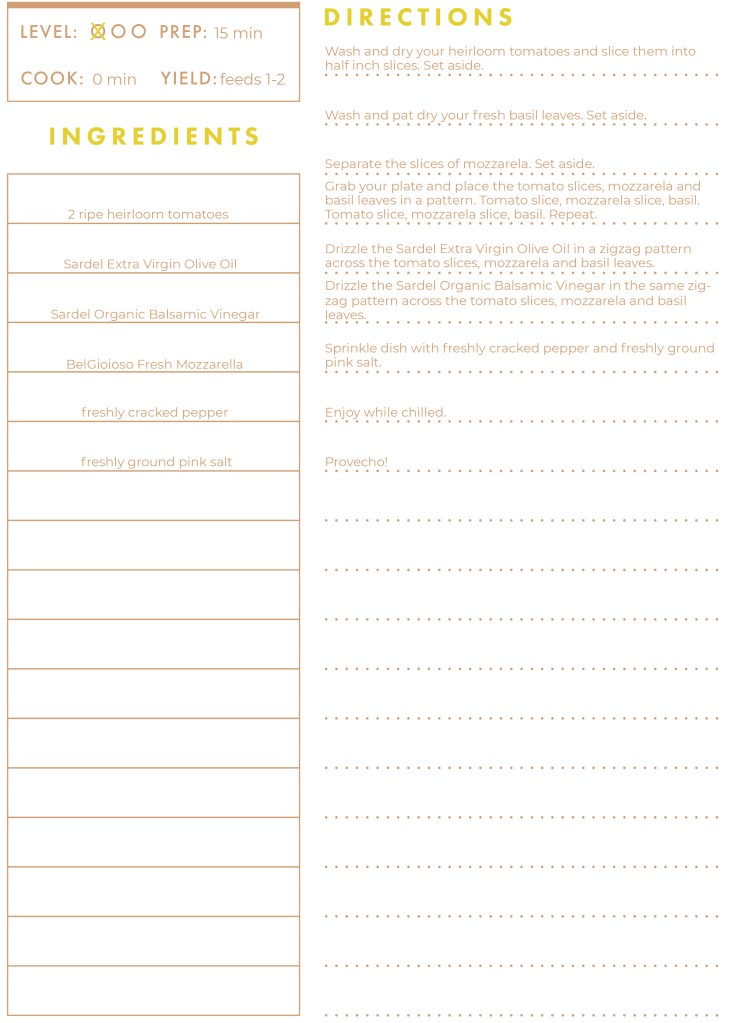 All you need to make your own Caprese Salad are a few fresh, heirloom tomatoes (the more colorful, the better), a package of BelGioioso Fresh Mozzarella and a bunch of fresh basil leaves to go along with the Sardel Extra Virgin Olive Oil and Sardel Organic Balsamic Vinegar. The flavors that the latter two ingredients provide is superior. The extra virgin olive oil balances the slight acidity of the tomatoes while the organic balsamic vinegar has the perfect viscosity to drizzle over the minty taste of the basil leaves. Top off with freshly cracked pepper and salt to taste. Provecho.