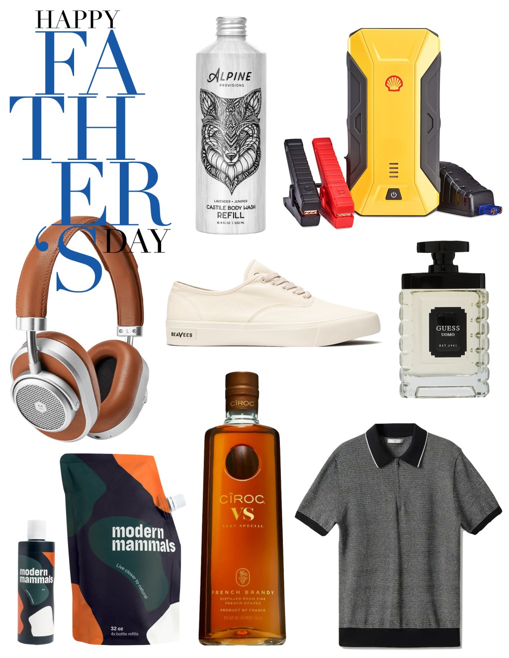 Alpine Provisions Castile Body Wash Refill $19.00 (reusable dispenser pump is sold separately) | You never think you need it until you do. Shell 12V Portable Lithium Jump Starter $89.99 | GUESS UOMO Eau De Toilette 3.4 oz $68.00 | Casual, comfortable and eco-friendly. What more can you ask for? Legend Sneaker SeaChange $88.00 | Your may think your dad’s music choices aren’t cool, but his headphones for sure are. Master & Dynamic Wireless Headphones $499.00 | It is like shampoo, but it is not. But it is better. And it doesn’t sud, but it is not supposed to. And it works! Modern Mammals Easy Rinse 8 oz bottle and 32 oz refill $26 / $80 | Dad’s need drinks. Sometimes of the adult kind. Well, probably most of the time. CÎROC VS Brandy $29.99 | Because cool dads dress cool. Mango Knit Cotton Polo Shirt $49.99