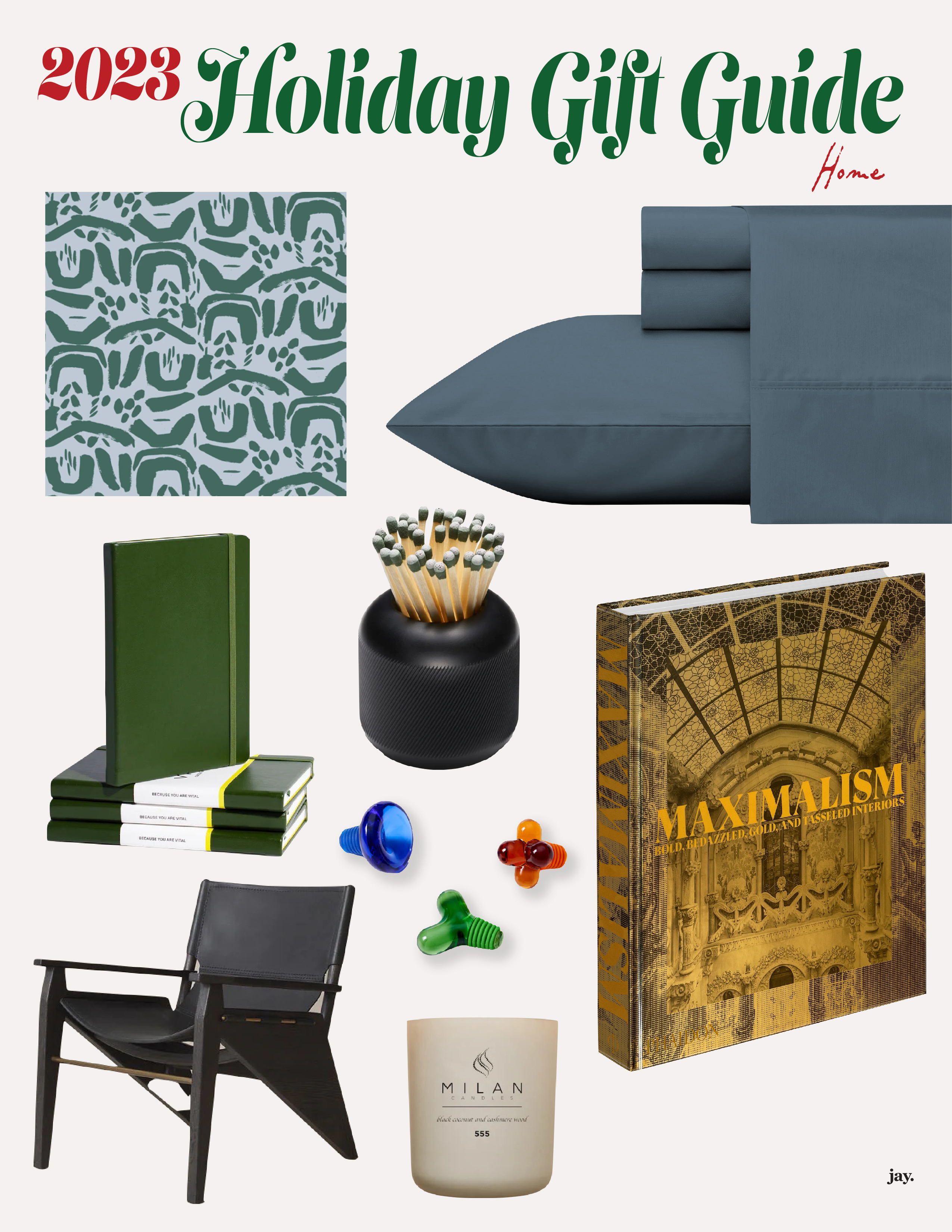 Chasing Paper Shaping Up wallpaper $120 | Sleepletics Celliant Performance Sheet Set $169.99 | VITAL Green Cactus Leather Lined Journal $29 | Craighill Match Striker $48 | Phaidon Maximalism coffee table book $89.95 | Fort Standard Hobknob Bottle Stopper $24 each | Banana Republic Home Maui Accent Chair $995 | Milan Candles 555 Black Coconut & Cashmere Wood candle $110