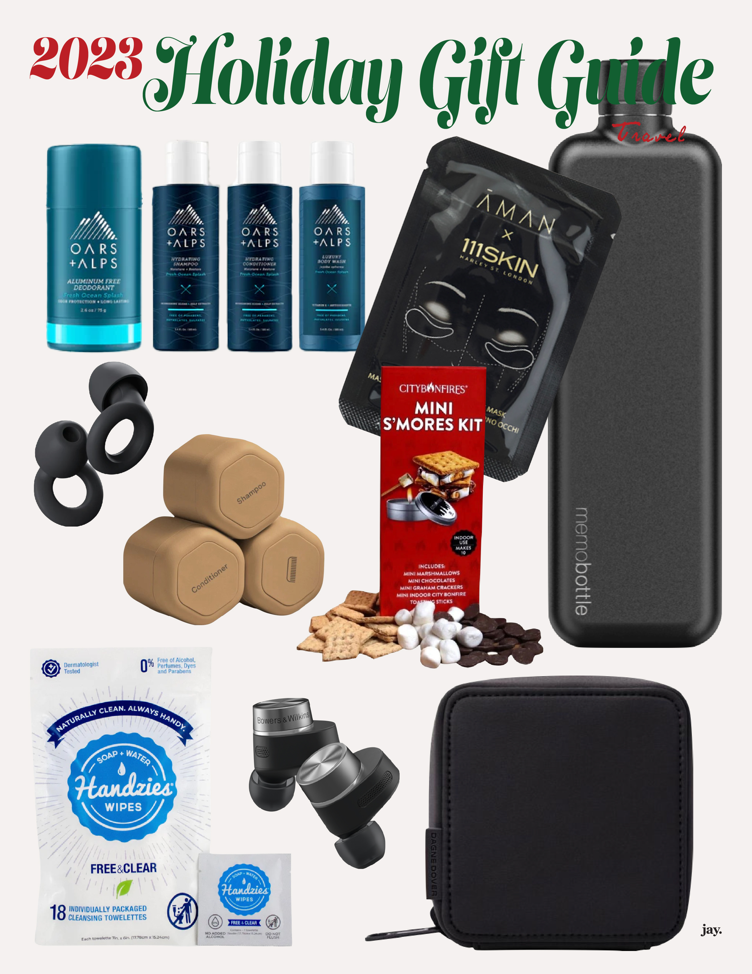 Oars + Alps Travel Kit – Fresh Ocean Splash $37 | AMAN Nourishing Gold Algae Eye Mask $110 | memobottle SLIM Stainless Steel bottle in black $60 | Loop Earplugs Quiet $24.95 | Cadence Hair Set $66 | City Bonfires Mini S’mores Kit (for indoor use) $24.95 | Handzies Free and Clear Soap + Water Wipes 18 Count $ 9.99 | Bowers and Wilkins Pi7 S2 earbuds $399 | Dagne Dover Arlo Neoprene Tech Organizer $50