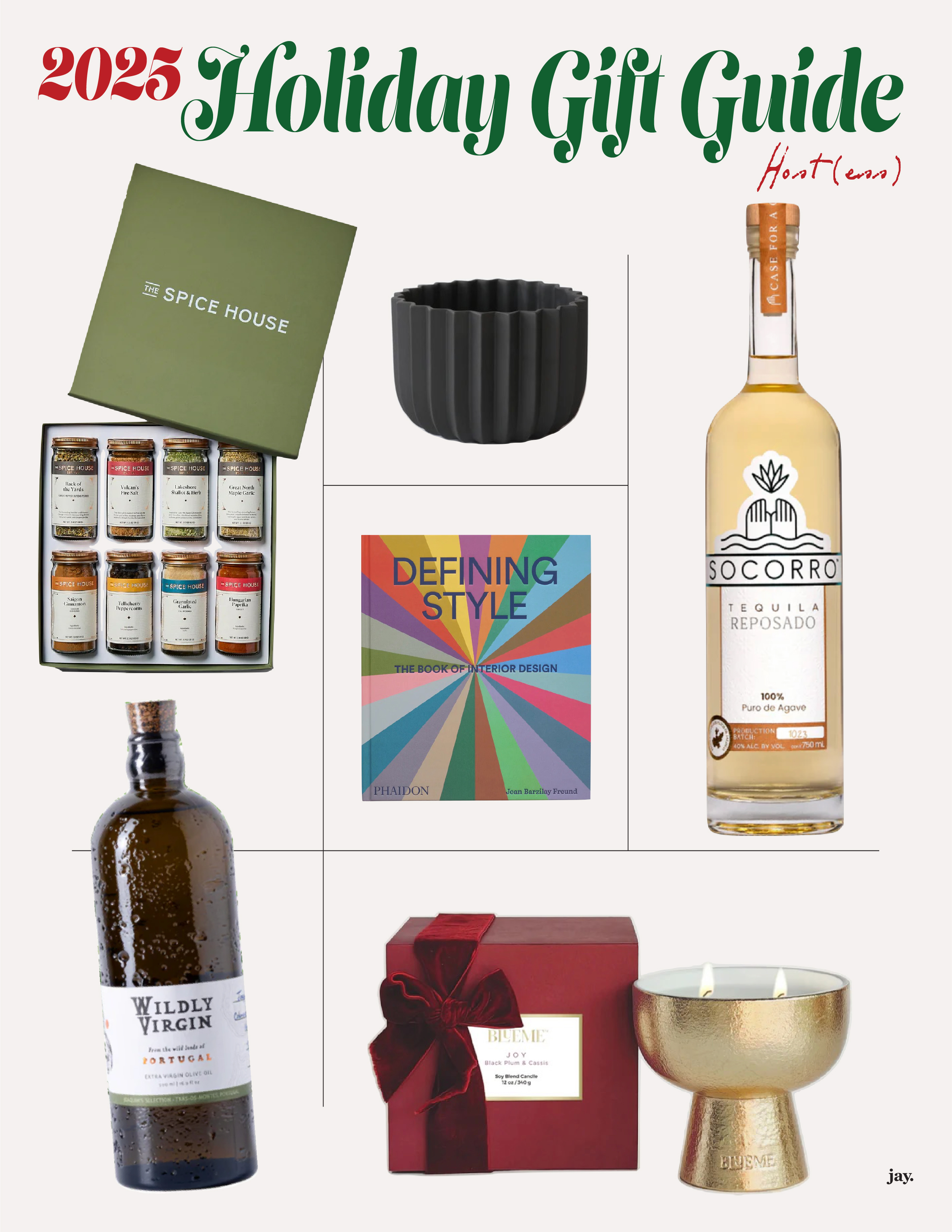 The Spice House Best Sellers Deluxe Collection $78 | Misewell Wrap Planter (4 sizes available) starting at $29 | Socorro Tequila Reposado $36.00 | Phaidon Defining Style: The Book of Interior Design $69.95 | Wildly Virgin Verde Extra Virgin Olive Oil $40 | Blueme Gold Holiday Candle | Joy $85